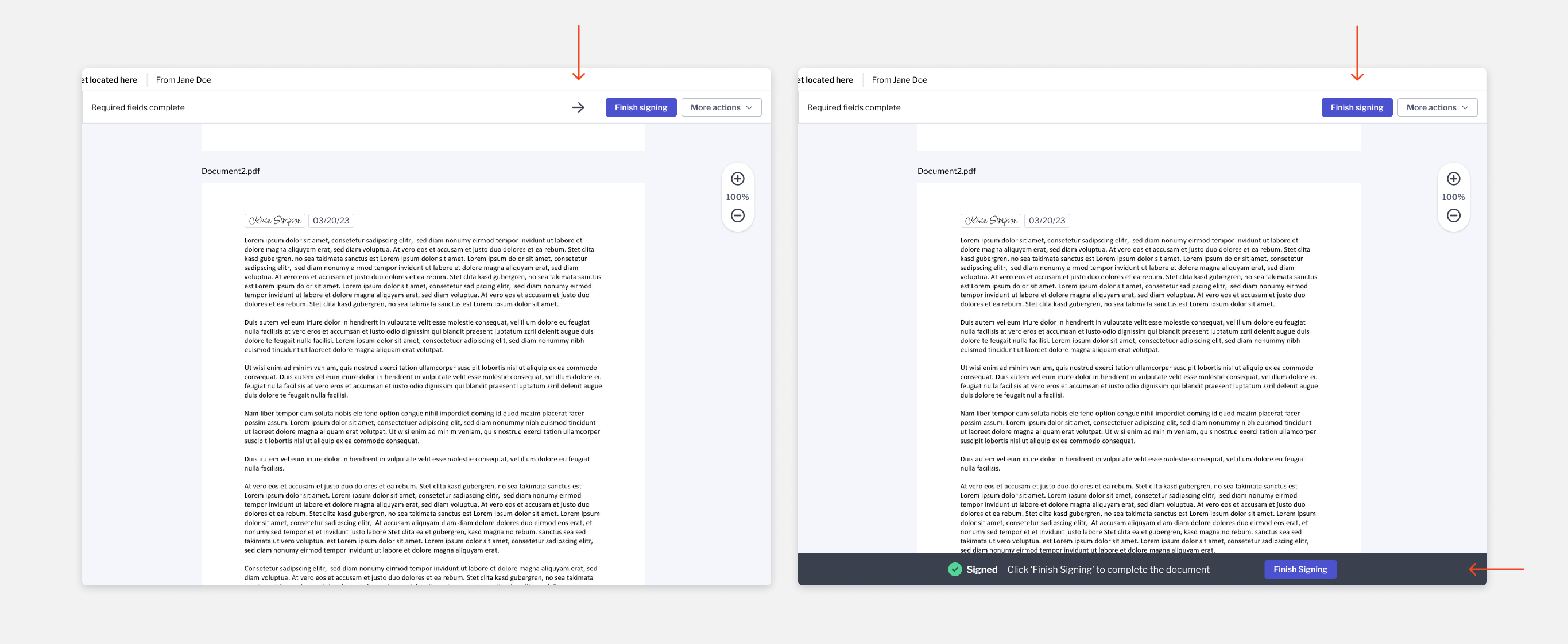 Current users often miss the finish signing button once they've finished signing fields. We can't legally finish the document automatically so instead we tested two versions of adding emphasis to the finish signing button. Overall more users preferred the version that added the finish signing bottom bar.