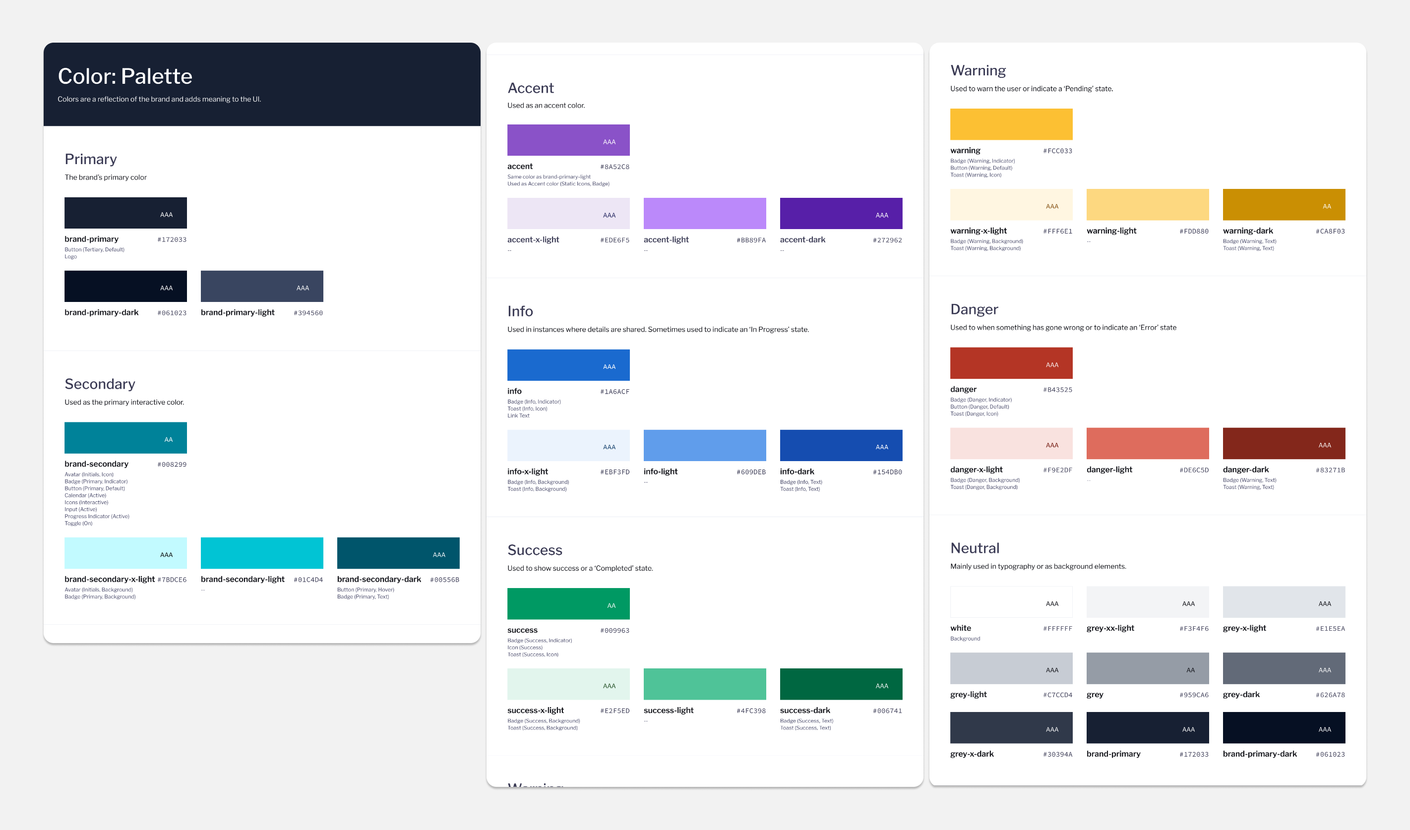 The founders had a specific color shade in mind for the primary color. My first task was to compile all the colors the company was currently using and discuss the existing color schemes and naming conventions with the development team. Based on their feedback and the necessity to maintain consistent naming conventions, I created a new palette that integrated seamlessly with the current system, avoiding the need for significant development updates.