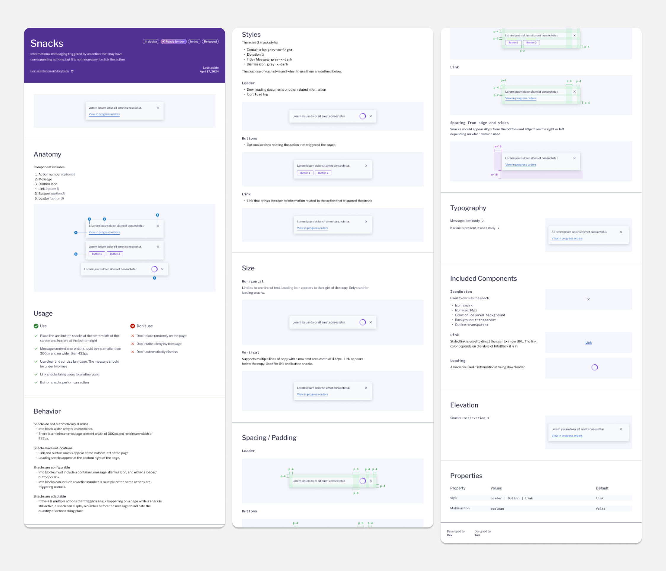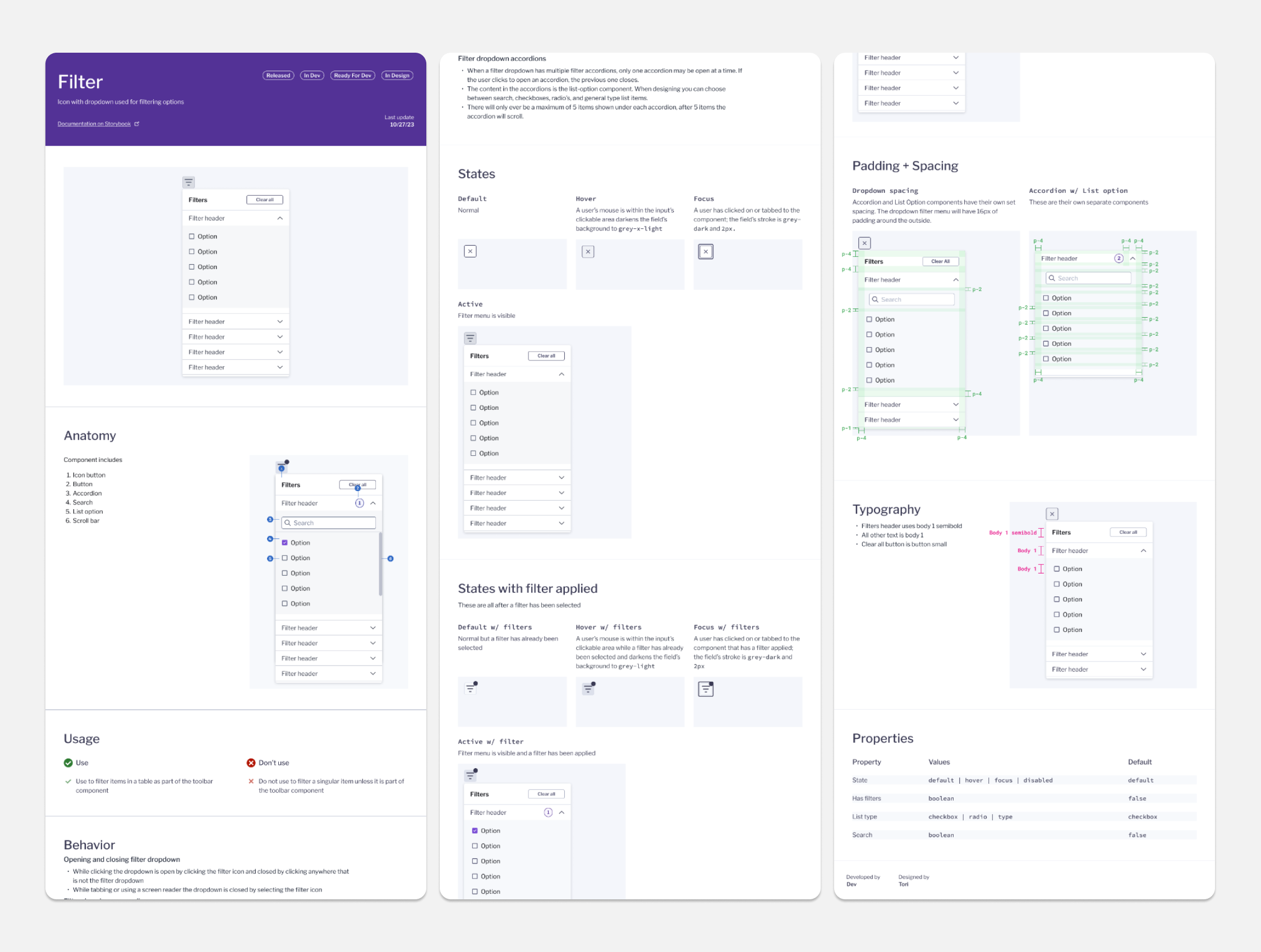 After auditing the system, we came up with a list of components that needed designs and documentation. These new components were built using the atomic design system. During the creation of each component I would list out every functionality that I needed the component to have and researched best practices and accessibility standards before creating designs. I had consistent design reviews and discussions with other designers and front end development before I haded off final documentation and created a Jira ticket for development. Here are some examples.